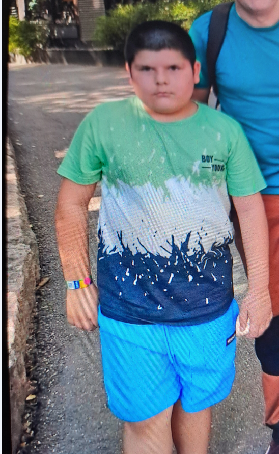 Kuvasta poiketen pojalla vaatetuksena harmaat shortsit ja valkosininen T-paita.