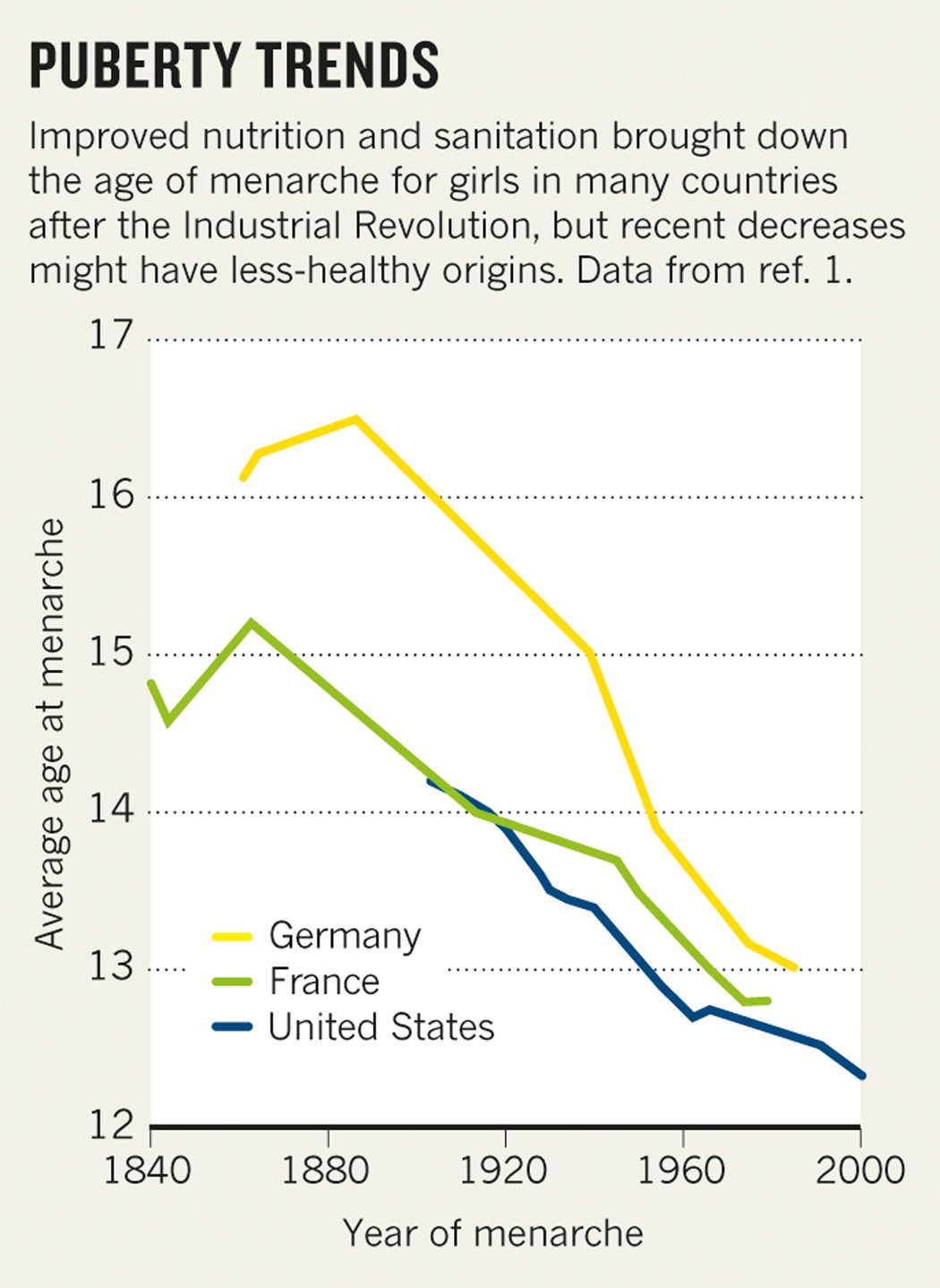 Parempi hygienia ja elinolot ei selitä kaikkea. Ennen kuukautiset alkoi keskimäärin 15v, nykyään 13v tai jopa aiemmin.