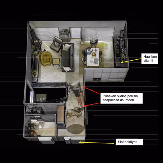 Surmatalon pohja ja Jannen ruumiin sijainti: