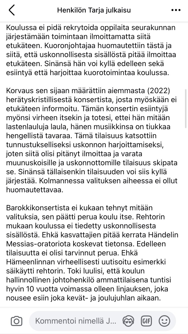 Joo, niin voikin pitää tauon tai piirtää tai lukea sen aikaa. Jos nimittäin tietää, että konsertti on uskonnollinen. Juuri siksi näistä uskonnollisista tilaisuuksista pitäisi kertoa oppilaille etukäteen, että ne ovat uskonnollisia! Tässä tapauksessa näin ei tehty ja siitä lapsen äiti valitti.