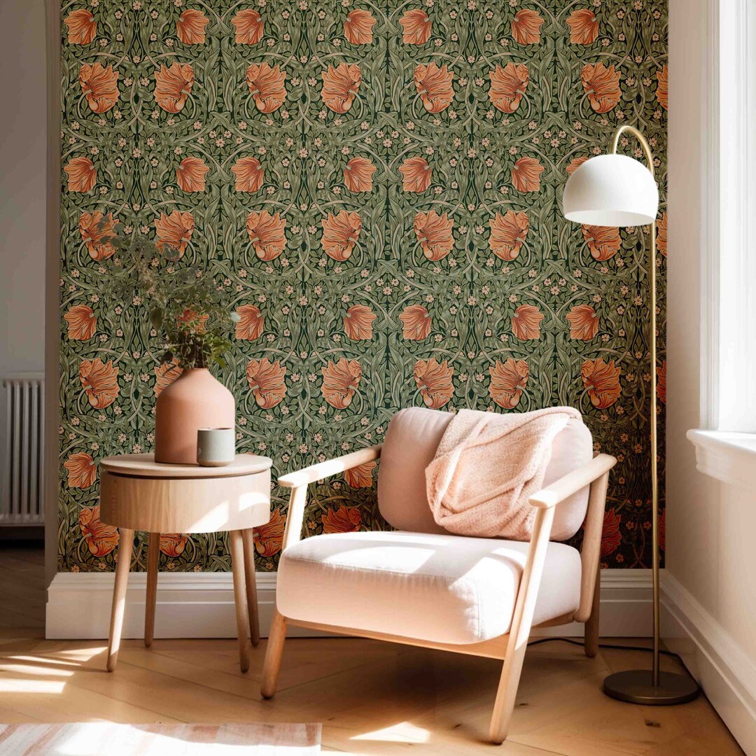 Aloittaja, meillä kotona on yhdessä huoneessa vastaava tiilimuuri, oranssinpunainen käsittelemätön. Tapettina huoneessa on tämä Morrisin Pimpernel