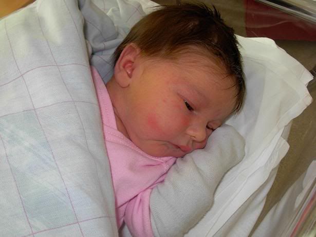 Eli sunnuntaina 16.3. heräsin klo 6 kipeään supistukseen. Jonkin aikaa pyörin sängyssä ja ajattelin, että taitaa lähtö tulla. Menin helpottamaan oloa suihkuun, mutta vesi tuntui vaan pahentavan jo ennestään kipeitä supistuksia, joita tuli koko ajan säännöllisen epäsäännöllisesti 2-5 minuutin välein. 7 aikaan herätin miehen ja sanoin, että vois lähteä viemään koiria hoitoon. Joel olikin mennyt mummille sopivasti jo edellisenä iltana. 7.30 soitin haikaranpesään ja sanoivat, että jos siltä tuntuu etten enää pysty olla kotona, saisin sinne lähteä. Vajaa tunti istuttiin vielä kotona, mutta sitten oli lähdettävä. Kätilö tutki ja arvioi vauvan olevan n.3900g. Hyvin oli kiinnittynyt. Kohdunsuu oli auki jo 5 senttiä, reunaa jäljellä n. puol senttiä. Klo 10.30 sain epiduraalin, alkoi olemaan liian kipeitä supistuksia. 11.22 puhkaisivat kalvot ja olin auki 6 cm. puolen päivän aikoihin alkoi supistukset olemaan taas tosi kipeitä. Sain toisen annoksen epiduraalia. Laittoivat vaikutuksen alettua myös tipan tehostamaan supistuksia pienimmällä annoksella. Tais se tippa tehota vähän turhanki hyvin, tuli nimittäin supistuksia alle minuutin valein. 14.05 sain luvan ruveta ponnistamaan. Supistukset tuli aika lyhyinä, mutta usein. Tässä vaiheessa mukana oli myös kätilö-opiskelija, joka auttoi tytön päätä syntymään. Kun pää oli ulkona, yritti tyttönen heti jo huutaa. klo 14.15 neiti sitten syntyi, pikkasen säikähtäneen oloisena. Pikkasen pientä kuivasivat ja neiti päästi ilmoille oikeen kovan huudon. Vauva oli hieman sininen, mistä vähensivät yhden pisteen, mutta muuten tosi hyvä ja jäntevä lapsi. Sain tytön heti syliin ja tutkimme kätilön kanssa tätä pientä ja suloista ilmestystä, joka kovaan ääneen huusi äidin mahan päällä. Mies leikkasi napanuoran. Istukka syntyi helposti. 8 tikkiä joutuivat laittamaan, tuli ensimmäisen ja toisen asteen repeämiä. Koko ajan vauva makasi mahallani, 15.10 hyökkäsi kiinni tissiin ja reilun tunnin siinä imi.