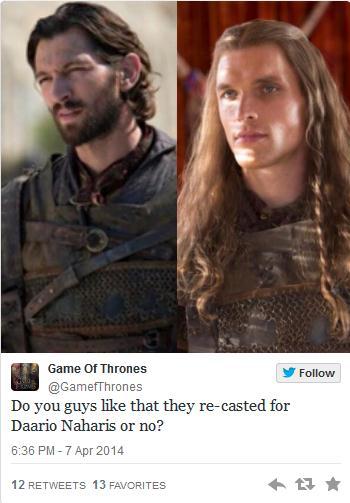 Eipä se Daario ihan blondi ollutkaan, mutta kuitenkin seuraajaansa hieman vaaleahiuksisempi. Kirjassa hahmo ymmärtääkseni on tummahiuksinen. http://images.rapgenius.com/30bfb32030ee30b29556f763f9fe7ddb.350x503x1.jpg